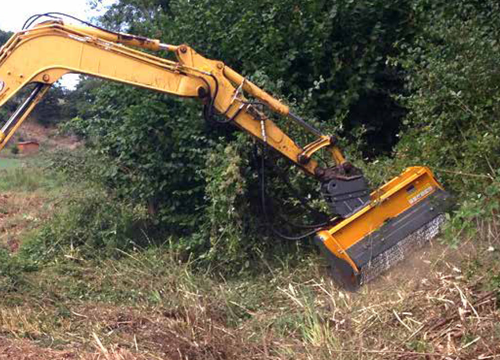 FEMAC hydraulic mulcher for mini and midi excavators from 8.0 to 16.0 tonnes operating weight. Ideal for trimming hedges and cutting brush on general agricultural and landscaping duties.