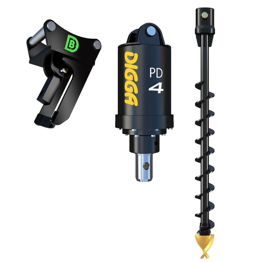 Digga Auger Package, with PD4 Earth Drill Drive Unit for 3.9 to 5.0 tonne mini excavators, with double pin cradle hitch and at least one tungsten auger flight. Price of auger flight added to package price at time of selection.