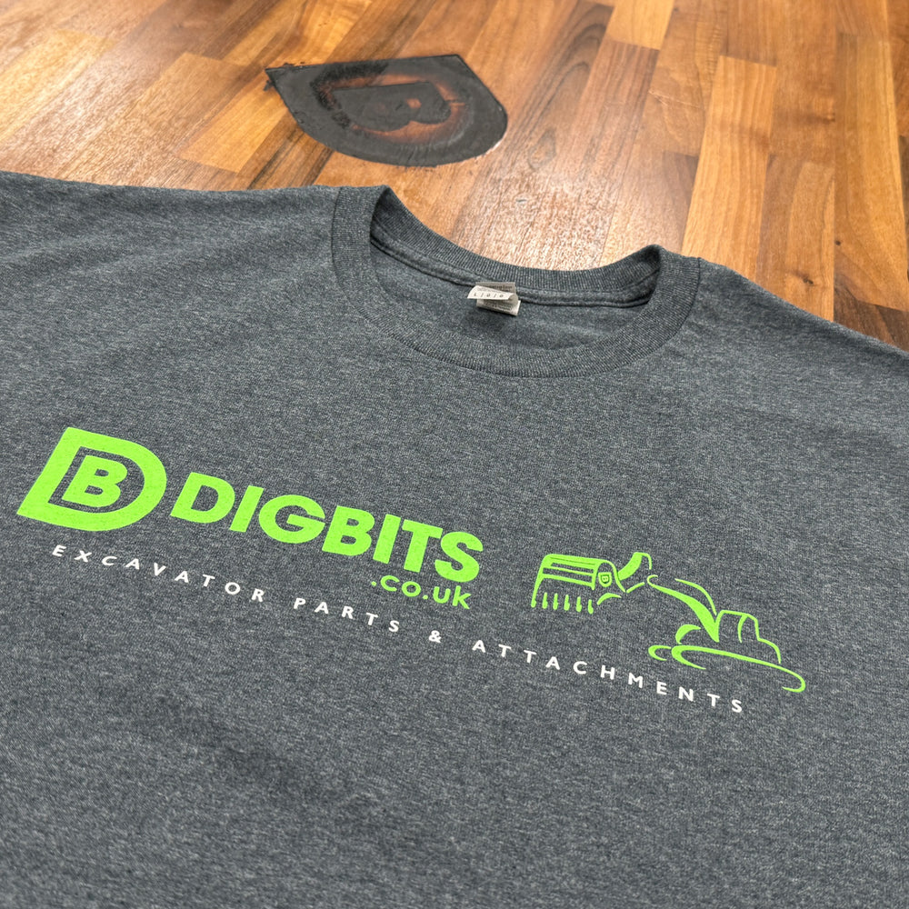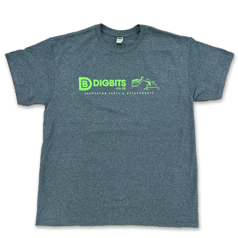 The latest, official DIGBITS company t-shirt. Grey, with printed logo in neon-green and white.