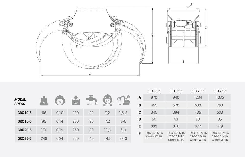 Timber Grab for mini excavators from 8.0 to 13.0 tonnes. Suitable for all types of general materials handling. Particularly well suited to agriculture, forestry and landscaping. Excellent for clearing up forest residue - timber, logs, brush. Equally suited to waste recycling tasks.