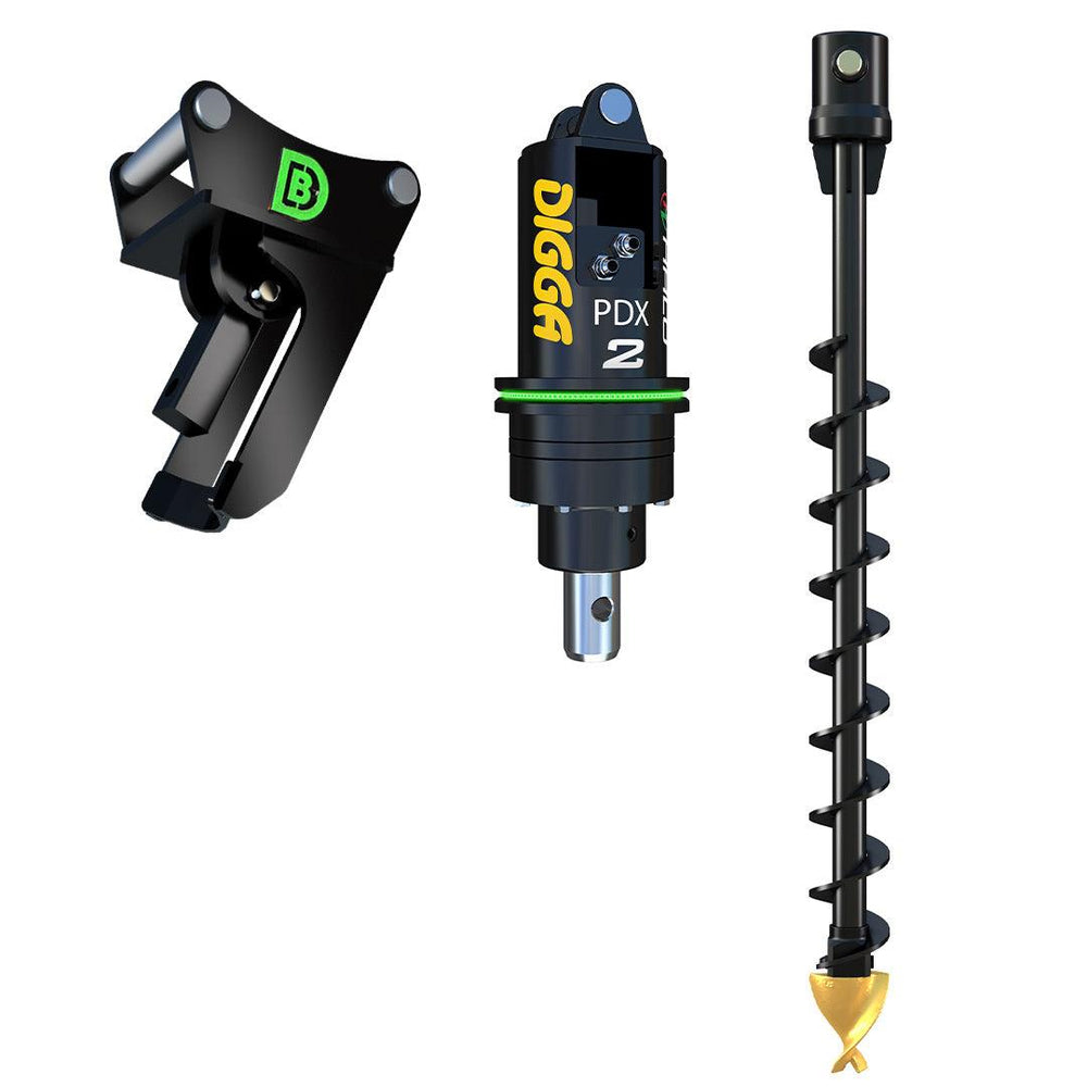 Digga Auger Package, with PDX2 HALO alignment system Earth Drill Drive Unit for 1.5 to 3.2 tonne mini excavators, with double pin cradle hitch and at least one tungsten auger flight.