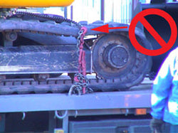 Strap or chain excavator over rubber tracks. It will cause severe damage and is not secure.