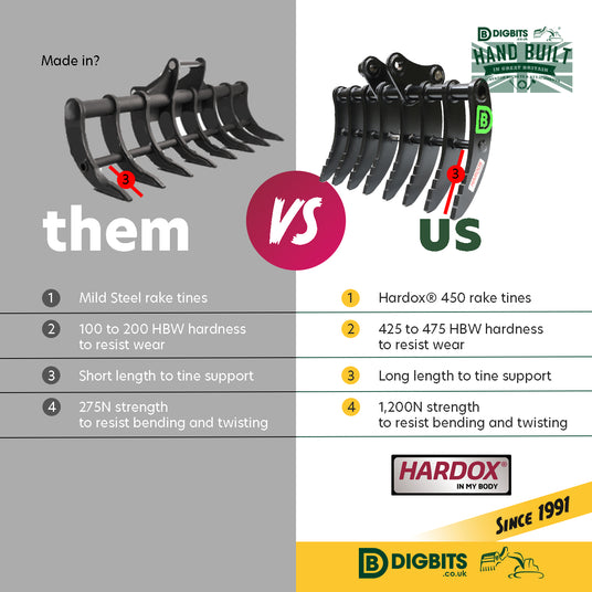 All our heavy duty excavator Land Clearance Rakes are manufactured in our own works in Staffordshire, UK.
